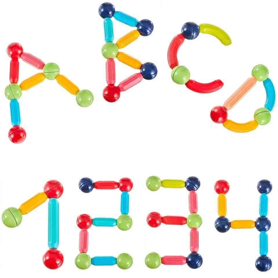 Juego de coloridas bolas y varillas magnéticas que juegan con la imaginación de un niño
